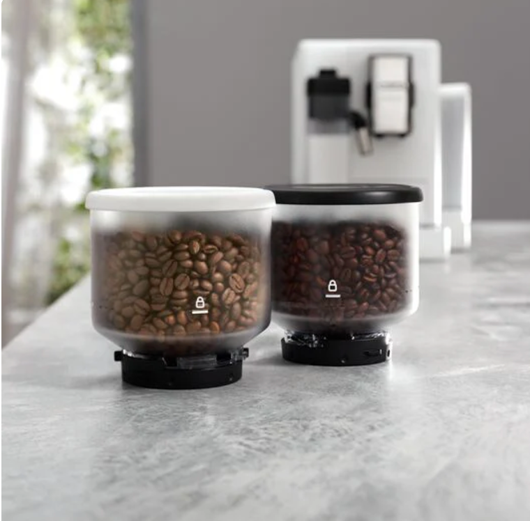 Bean Switch System le permite explorar nuevas variedades de granos. Rivelia viene con dos tolvas intercambiables de 250 g para que puedas disfrutar de diferentes sabores de café. Para prepararse para el cambio, primero use el modo Switch para vaciar el molinillo de los granos actuales, eligiendo preparar un café o molerlos.
