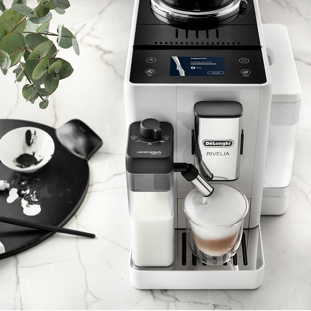 Disfrute interactuando con la intuitiva pantalla a color totalmente táctil de 3,5", con ricas animaciones. Rivelia aprende su rutina de café y ajusta su menú a lo largo del día, para una experiencia de café inmersiva adaptada a usted, con hasta 4 perfiles de usuario.